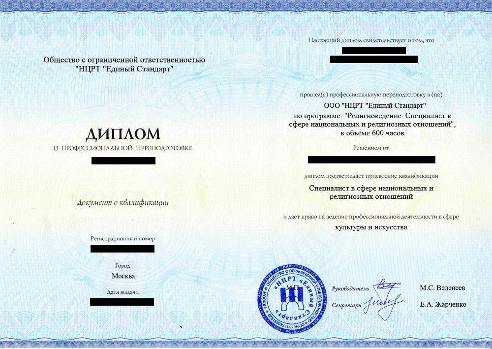 • «Специалист в сфере национальных и религиозных отношений» с правом ведения профессиональной деятельности в сфере культуры и искусства